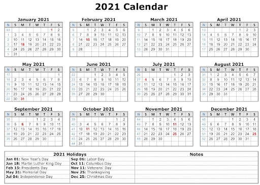 2021 Calendar With Holidays Listed